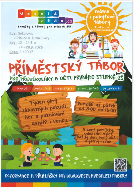 V období letních prázdnin konkrétně od 10. – 14.8. a 24. – 28.8. 2026 pořádá organizace „Veselá věda“ pro předškoláky a děti prvního stupně „Příměstský tábor“. Zázemí bude v sokolovně v Jakubě.